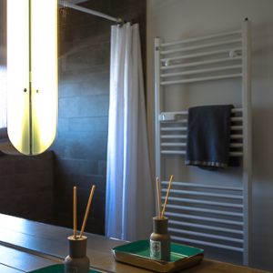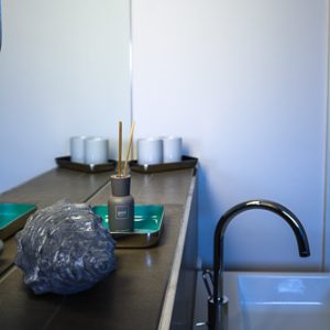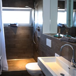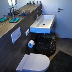 Im Badezimmer dominieren hellgraue Naturtöne im Einklang mit den großen Spiegelflächen.