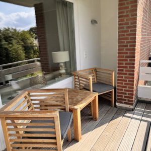 Der in Südwest Lage ausgerichtete Balkon, hat eine Größe von ca. 6m² und ist sehr geräumig. Ausgestattet mit Sitzmöbeln bietet er gerade nach einem anstrengenden Tag am Meer den richtigen Rahmen für einen Sun-Downer.
