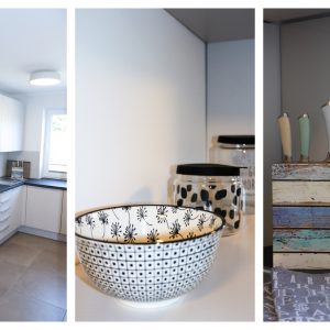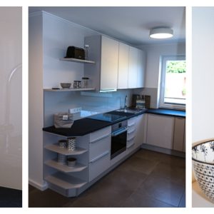 Die offene Küche ist in den Wohnbereich integriert und fügt sich optisch gut ein. Sie ist ausgestattet mit einem Heißluftherd mit Induktionkochfeld, Kühlschrank mit Gefrierfach, Geschirrspüler und viel Schrankplatz. Die Küchenausstattung ist hochwertig und mit Designartikeln wie z.B. der Geschirrlinie Bone China by ASA, Küchenhelfern von MENU, WMF, LINUM etc., um nur einige zu nennen, ausgestattet.