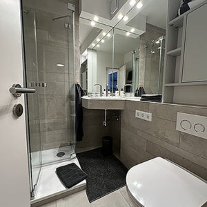 Das Bad ist hell und geschmackvoll gefliest. Ein Durchlauferhitzer bietet Ihnen unbegrenzt heißes Wasser.