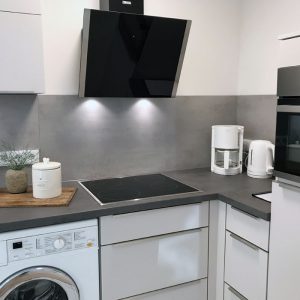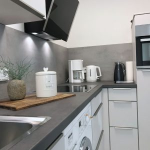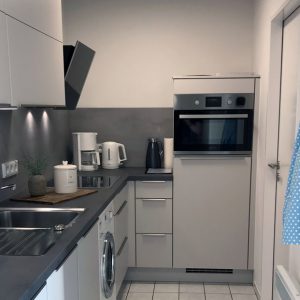 Die Ferienwohnung lässt es an nichts fehlen. Die komplett eingerichtete Küche ist mit Kühlschrank, Gefrierfach, Mikrowelle, Kaffeemaschine und Wasserkocher ausgestattet.